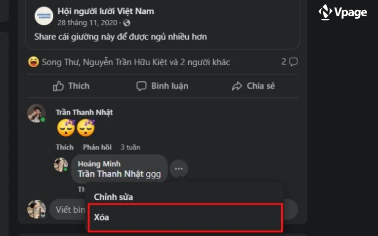Cách thực hiện rất đơn giản: bạn chỉ cần nhấp vào nút “Xóa” bên phải bình luận để loại bỏ. Tuy nhiên, hãy lưu ý rằng sau khi xóa, bình luận sẽ không thể khôi phục lại được. Đồng thời, việc xóa quá nhiều bình luận cũng có thể làm giảm lượng tương tác tự nhiên trên fanpage, vì vậy bạn chỉ nên áp dụng khi thật sự cần thiết.